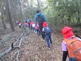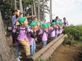 ここからは本格的に山の中を進んでいきます。「ここに入口があったの!?」と驚いていた子ども達!「木がいっぱいで、急に夜になった!」「空が見えない!」と言ってみんなわくわく☆