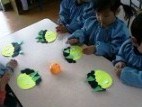 まずは、お面づくりから。黄色い丸い紙に黒い小さな丸い紙を貼っていくと、可愛いオニの顔になりました☆