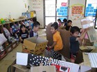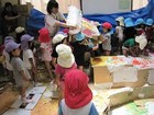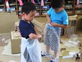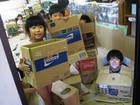 今日は、段ボール遊びにみんな熱中。まずは、マイ段ボールを確保したら、中に入ってお風呂にしたり、電車にしたり。そのうち、電車が連結してながくなったり、トンネルやおうちづくりも始まって、先生たちは大忙しでした。