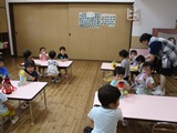 始めはうがい薬をコップに入れる時、こぼしてしまう子もたくさんいましたが、ボトルをしっかり持ってコップに入れられるようになりました。今日もみんな上手に入れられ、うがいが出来ていました!