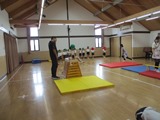 クラス毎の体育の指導の合間に、年長のクラスでは、なわとびの紐を使ってなにやら練習をしています。