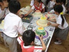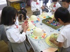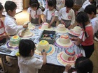 年中さんの紙粘土製作、色を塗って、紙のおかずも盛り付けると、