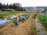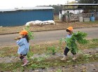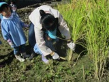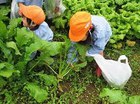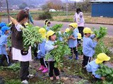 年中組は、大根を収穫するため、有機農法の畑に出掛けてきました。園バスから降りてきた子ども達は、やる気満々。大根をどうやって抜くか手本をみた後、それぞれ挑戦です。触れると少しチクチクする葉っぱをまとめ、その下の大根をしっかり両手でつかんで上に引き抜きますが、上手に抜ける子もいれば、立派な大根に苦戦する子も。先生やお友達に助けてもらいました。「ぬけた!」どの子もニコニコ顔で自分で抜いた大根を見せてくれました。