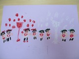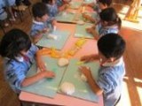 作っていたのは、色とりどりの輪かざり。卒業式と入園式では、会場となる園のホールの天井に園児達が作った輪かざりを飾っています。今日は、年長組が作っていましたが、別の日には、年中、年少組でも作りました。年中の子ども達は、折り紙の端と端をきれいに揃えて貼りつけるために真剣なまなざしで指先を見つめていました。年少の子ども達は、はじめての輪かざり作りに、興味深々。まだまだ、覚束ない指先ですが、折り紙を輪にする作業を繰り返して、輪かざりが長くなるさまを喜んでいました。