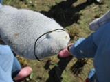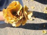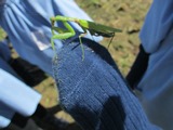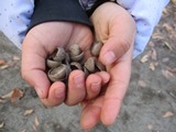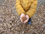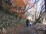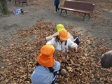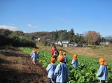 収穫の後は、泥団子を作ったり、虫を探したり、畑で遊ばせてもらいました。畑の土は、フカフカして、さらに長靴をはいているので、歩いたり、走ったりするのも園庭とは違った感触でおもしろかったです。晩秋の里山の景色に囲まれて、頭上にひろがる空は大きく広々としていて、伸びやかな気持ちになりました。