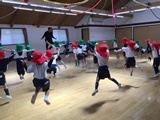 ゆうぎ・バルーンの練習中の年中さん。晴れ舞台が楽しみです。