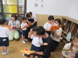 子ども達は、自分で好きな本を選ぶことができるので、貸出日を楽しみにしています。どれにしようかな?とじっくりと選ぶ子もいれば、ほぼ直感で、パパッと決めて借りていく子と様々ですが、「何を借りたの?」ときくと、どの子も嬉しいそうにバックの中から本を出して、見せてくれました。