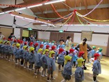 ホールに全学年で集まって、対面式を行いました。クラスのカラー帽子をかぶって集まったので色とりどりのチューリップ畑のようでした。