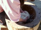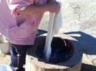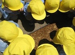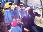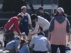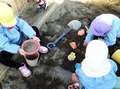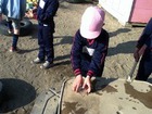 みんなで協力して、バケツで水を運んで、穴に水をいれると、