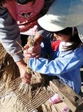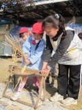 もみちゃんを土の上にパラパラした『もみふり』、なえちゃんになった苗を植えた『田植え』、つぶつぶのお米が実った稲を刈った『稲刈り』、お米をパラパラにした『脱穀』、そして今日はお米を蒸かしておもちに変身させるの『おもちつき』