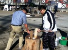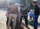 そして子ども達がおもちつきをする前にお手伝いのお父さん達が練習。
