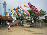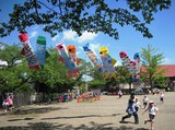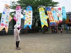 クラス毎に胴体に絵を描いて作ったこいのぼり達。今朝からお庭で気持ちよさそうに泳いでいます。