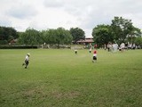 広々とした芝生、大きな木々の新緑の輝き、爽やかな景色の中、