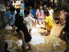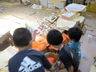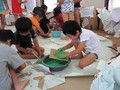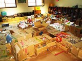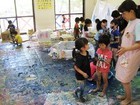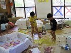 昨日の続きで、小物の廃材を使って、ごっこ遊びや、道具を作ったり、新らしゲームを考えたり、思い思いに遊びを展開。後半には小麦粉糊を使って紙貼りしつつ、やはり糊遊びが盛り上がりました。