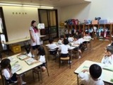 今年は、室内だけにとどまらず、園庭にでていくシーンも多かったです。4日目のとても暑い日に夏の日差しのもとでの絵の具遊びが印象的でした。
