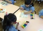 先日、年長組では、個人絵の具を使って絵を描きました。まずは、黒のペンで形を描き、絵の具で色付け。さて、何を描いているのかな?四角の中に、細い棒のようなものが並んでいます。その棒一本一本に文字やら線やらが細かく描きこまれています。よくよく見ると画用紙の前には、ふたをあけたパッセルが。子ども達は、箱に入ったパッセルを描いていたのでした。普段それぞれが使っているものなので、長い棒が並んでいるのもあれば、それぞれ長さが違う棒が描かれている絵もあり、一人ひとりが自分のパッセルを描いているのが良くわかりました。絵の具で色を付けるとその形が良くわかり、一本一本色が混じらないように丁寧に塗る様子に自分のパッセルへの愛着を感じました。