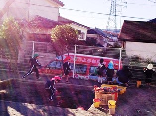 小春日和の暖かい日となりました。式の後は、全学年、園庭に。年少組、年中組の子ども達はめだか組の子ども達も交えて、砂場や遊具で思い思いの遊びを楽しんでいました。年長組は、運動会の時に父母競技で行った新幹線リレーに挑戦。白熱したレースとなり、大いに盛り上がりました。のびのびと遊ぶ姿にこの二学期の充実度を感じました。