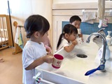 カップに色水を入れてジュースにしたり、黄色い色水の上に隣の泡遊びで作ったモコモコの泡を乗せてビールにしたり、卵パック1つ1つに違う色を入れたり...子ども達の発想は無限大。 いろんなあそびを楽しんでいました!