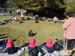園長先生や父母の会会長さんの話を聞き、体育の先生と山に登る前に準備運動! しっかり体を伸ばし準備完了‼