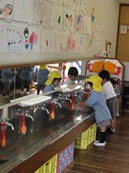 保育室の壁一面の流しに並んだ水道の使い方も教わりました。