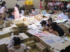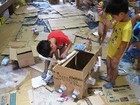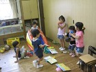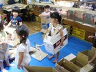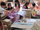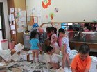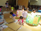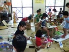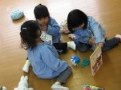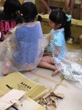 昨日の続きで、小物の廃材を使って、ごっこ遊びや、道具を作ったり、新らしゲームを考えたり、思い思いに遊びを展開。後半には小麦粉糊を使って紙貼りしつつ、やはり糊遊びが盛り上がりました。
