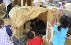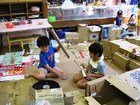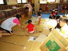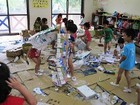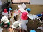 今日は、段ボール遊びにみんな熱中。まずは、マイ段ボールを確保したら、中に入ってお風呂にしたり、電車にしたり。そのうち、電車が連結してながくなったり、トンネルやおうちづくりも始まって、先生たちは大忙しでした。
