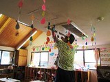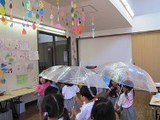 絵が描けた雨粒は、つなげて、絵画の先生が天井から吊るしてくれました。