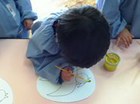 年中さんが、シャボン玉を使って素敵な水玉模様をつけました。