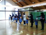 | まずお話会の始めは、手遊び・歌遊びで 大好きなママとスキンシップ。 「線路は続くよ どこまでも」 「バスに乗って」の歌に合わせて、 手や身体を揺らしてとっても楽しそう ・・・どの子もスマイルいっぱいです。 |