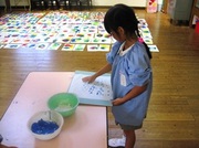 年中さんが、シャボン玉を使って素敵な水玉模様をつけました。