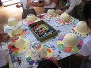 年中さんの紙粘土製作、色を塗って、紙のおかずも盛り付けると、