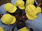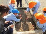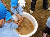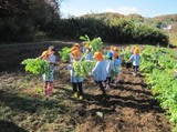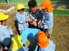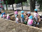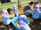 年長児と年中児は、秋が深まる里山の畑にさつまいも掘り行ってきました。シャベルや手を使って土を掘ると紅色のおいもが出てきて、子ども達は大喜びでした。細長い一本を慎重に手を使って掘りだしたり、次から次に掘りだしてあっという間にいもの山ができている子もいました。複数のいもが連なった形で引き抜くように掘りだして周りの子ども達からも「大きい☆」との声が上がる子もいました。おみやげに持ち帰ったおいもは、どんな料理に変身したのか、明日報告をきくのが楽しみです。