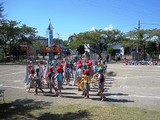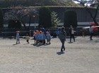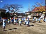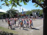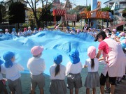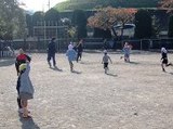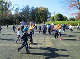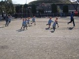 気持ちの良い秋晴れのもと、園庭で全学年一緒に運動会ごっこを楽しみました。まずは、年少のおゆうぎ。3学年縦割りで3つの円をつくり、踊りました。年長さんも年中さんもみんなニコニコ嬉しそうでした。続いて、年中のバルーンにもみんなで挑戦。バルーンに初めて触る年少さんはドキドキワクワク、昨年やった年長さんはちょっぴり余裕、もちろん年中さんは、自信満々。波のようにバタバタとふったり、膨らませてみたり、青空に赤、青、黄のバルーンが鮮やかでした。年長の綱引きは、男女対抗戦で再現。一直線に全学年が並び、オーエス、オーエス、迫力満点でした。最後の年中、年長合同リレーでは、年少さんは可愛い応援団になって、白熱しました。