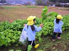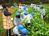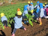 年中組は、大根を収穫するため、有機農法の畑に出掛けてきました。園バスから降りてきた子ども達は、やる気満々。大根をどうやって抜くか手本をみた後、それぞれ挑戦です。触れると少しチクチクする葉っぱをまとめ、その下の大根をしっかり両手でつかんで上に引き抜きますが、上手に抜ける子もいれば、立派な大根に苦戦する子も。先生やお友達に助けてもらいました。「ぬけた!」どの子もニコニコ顔で自分で抜いた大根を見せてくれました。