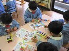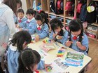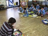 かぴら幼稚園では、父母の会の活動の一環として、園の蔵書と坂戸中央図書館からお借りした本を合わせて、園児たちに図書の貸し出しを行っています。図書室(兼会議室)で、借りた本と紙芝居をいれて帰るバックを持って、借りる本を探します。どの子も真剣です。