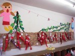 作っていたのは、色とりどりの輪かざり。卒業式と入園式では、会場となる園のホールの天井に園児達が作った輪かざりを飾っています。今日は、年長組が作っていましたが、別の日には、年中、年少組でも作りました。年中の子ども達は、折り紙の端と端をきれいに揃えて貼りつけるために真剣なまなざしで指先を見つめていました。年少の子ども達は、はじめての輪かざり作りに、興味深々。まだまだ、覚束ない指先ですが、折り紙を輪にする作業を繰り返して、輪かざりが長くなるさまを喜んでいました。