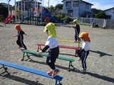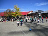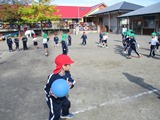 気持ちの良い秋晴れのもと、園庭で全学年一緒に運動会ごっこを楽しみました。まずは、年少のおゆうぎ。3学年縦割りで3つの円をつくり、踊りました。年長さんも年中さんもみんなニコニコ嬉しそうでした。続いて、年中のバルーンにもみんなで挑戦。バルーンに初めて触る年少さんはドキドキワクワク、昨年やった年長さんはちょっぴり余裕、もちろん年中さんは、自信満々。波のようにバタバタとふったり、膨らませてみたり、青空に赤、青、黄のバルーンが鮮やかでした。年長の綱引きは、男女対抗戦で再現。一直線に全学年が並び、オーエス、オーエス、迫力満点でした。最後の年中、年長合同リレーでは、年少さんは可愛い応援団になって、白熱しました。