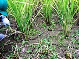 係のお母さんたちの助けを借りて、園児一人ひとり、鎌を持ち、稲の根元を切り取ります。