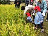 6月に子ども達が田植えした苗が大きく育ち、稲穂となりました。お手伝いのお母さんに介添えをしてもらいながら、一人ひとりが鎌で稲を刈り取りました。