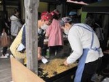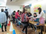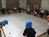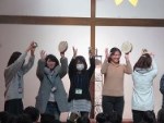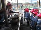 子ども達が楽しみにしていたおもちつき。園庭では、てぬぐいでねじり鉢巻きをして、みんなやる気満々。お手伝いのお父さんと地元大学の学生さん達が搗いてくれた餅を、ひとりひとり、子ども用杵使って10回ずつ搗きました。役員のお母さんたちがきなこもちに仕上げてくれた搗きたてのおもちをほおばると「おいしい☆」「やわらかい☆」との声があちこちからあがりました。子ども達がもみふりをして育てた苗を田植えし、秋に実った稲穂を刈り取り収穫したもち米でついたおもちですから、その味はさらに格別です。