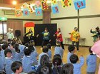 10月の誕生会も、盛りだくさんの内容で楽しい時間を過ごしました。パパとママからの歌のプレゼントは、「つき」。♪でた~でた~つきが~♪で始まるこの歌を子ども達もフリをつけて歌ってみました。そして、先生たちの出し物は、組立体操☆運動会での年長さんに負けないように先生たちも真剣でした。そして、かぴらのママ達の有志グループ「はっぴーまま」さん達のクイズやマッジクに子ども達は大喜び。「チチンプイプイ~☆」の呪文がとっても上手になりました。最後の「エビカニクス」は、運動会の全体遊戯だった曲。ママ達も子ども達も先生達もノリノリで盛り上がりました。キラキラ赤いかんむりをかぶった10月生まれの子ども達は、小ガ二、小エビのようでした。