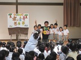 最後に子ども達がお礼の気持ちを込めて歌った園歌をとても上手に歌えましたねとお褒めの言葉を頂き、大変嬉しく思いました。これからも、素敵な歌をたくさん聞いて、歌って、心を豊かに育てていきたいです。