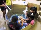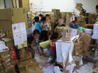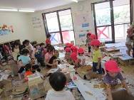 二日目になった造形遊びWEEK。 どの子もやる気満々で登園してきました。年長各クラスは、朝、一気に形を作り上げていました。その集中力は、さすがです。各家庭から集まった様々な廃材を集めた部屋にいって、好きなアイテムを選んで、制作活動。カッターを使っての難しい切り取り作業は、お助けマンの先生が担当します。年中児たちは、小麦粉糊を使って糊貼り。独特のベタベタヌルヌルの感触を楽しみながら両手を使って紙に糊を伸ばして段ボールに貼っていきます。塗れば塗るほど、自分も床もヌルヌルしてきて、それも楽しんでいました。年少児たちは、昨日に続き、段ボール遊び。昨日は、おどおどしていた子も今日は、興味をもって楽しんんでいる姿がみられ、遊び方にも変化が。どの子もイキイキニコニコでした。明日の何をしようかな。