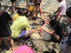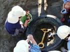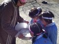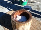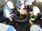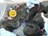 みんなで協力して、バケツで水を運んで、穴に水をいれると、