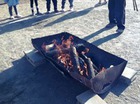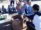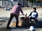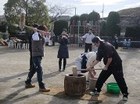 そして子ども達がおもちつきをする前にお手伝いのお父さん達が練習。