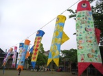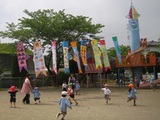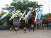 クラス毎に胴体に絵を描いて作ったこいのぼり達。今朝からお庭で気持ちよさそうに泳いでいます。